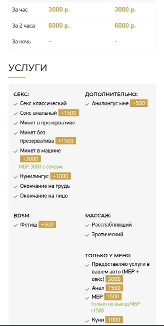 Часик 3000, мбр доп. 1500, куни доп. 1000, анал доп. 1500, анилингус мне доп. 500.