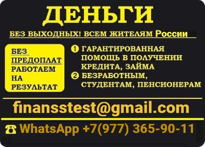 Вы можете получить кредит без предоставления справок и подтверждения занятости. Кредит для проблемной категории заемщиков без лишних вопросов и обеспечения, при любой кредитной истории, просрочках и долговых нагрузках. Главное условие - Ваша платежеспособность для внесения ежемесячного платежа. Работаем в регионах страны и только с совершеннолетними гражданами РФ. По всем интересующим вопросам пишите нам на эл. почту finansstest@gmail. com, по телефону или WhatsApp +7(977) 365-90-11