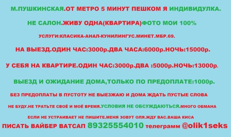 Здравствуй дорогой мой. Приеду или приглашу, и скрашу твое время. У меня молодое тело, нежнейшая загорелая кожа, упругая попка и грудь. Я милая и развратная. Обожаю кекс, отдаюсь процессу на полную. ОБОЖАЮ оральный кекс, сладкий и слюнявый мбр ВКЛЮЧЁН В СТОИМОСТЬ. пишите в TG: @olik1seks или WhatsApp Вайбер по номеру +79325554010 обсудим.