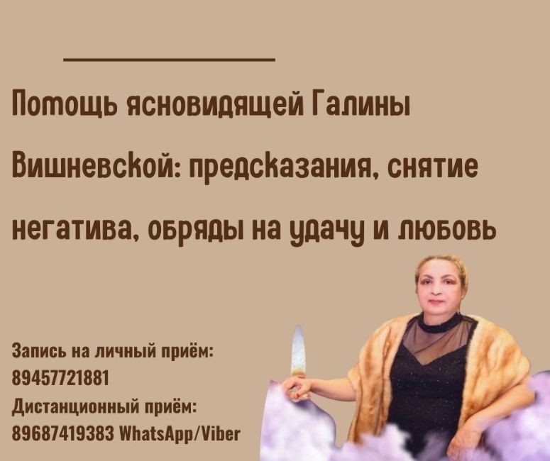 Галина Вишневская – потомственная ясновидящая, целительница и предсказательница, наследница мудрости и знаний древнего княжеского рода венгерских цыган Дошкещи. Галина не просто предлагает помощь, она становится вашим проводником в мир гармонии, удачи и любви.