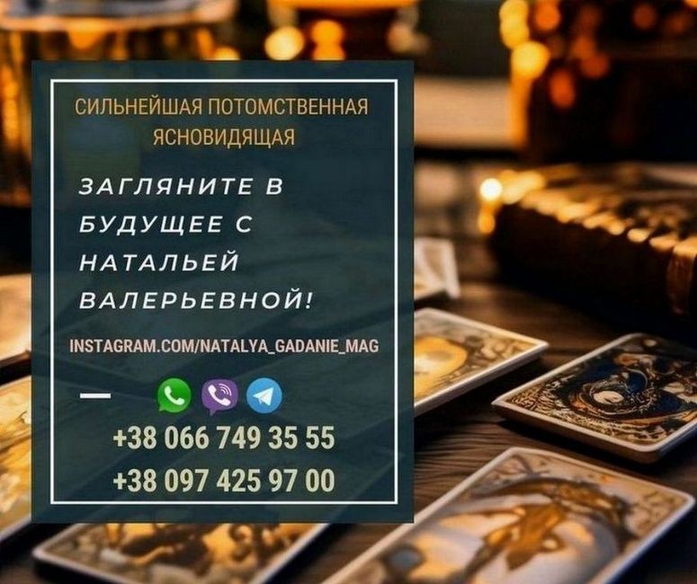Наталья Валерьевна – ясновидящая, целительница и таролог с более чем 25-летним опытом, готова помочь в самых сложных жизненных ситуациях. Ее профессиональные знания и успешная практика помогли тысячам людей, которые обратились за помощью. В рамках консультации предлагается гадание по фото и картам Таро, а также диагностика негативных воздействий: сглаз, порча, проклятие, венец безбрачия.