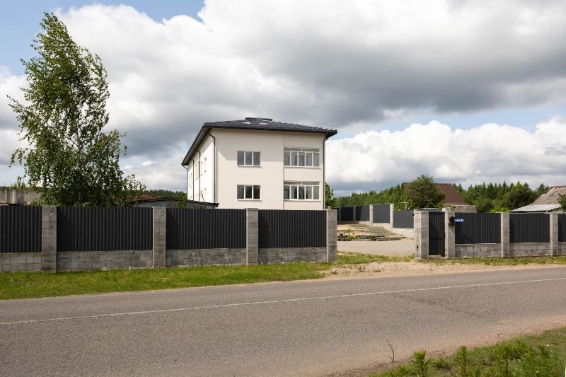 Территория огорожена ( столбы- бессер + металл) раздвижные ворота.