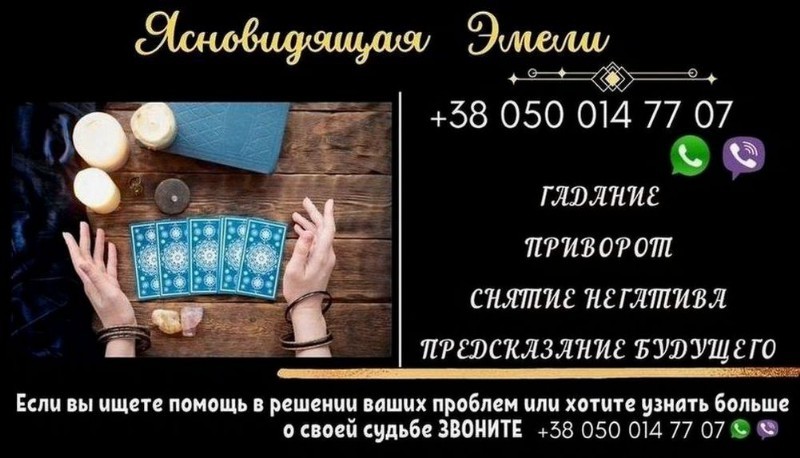 Эмели — таролог, ясновидящая и экстрасенс с большим опытом. Она помогает людям разобраться в себе, почувствовать опору, понять причины происходящего и найти путь к улучшению своей жизни.