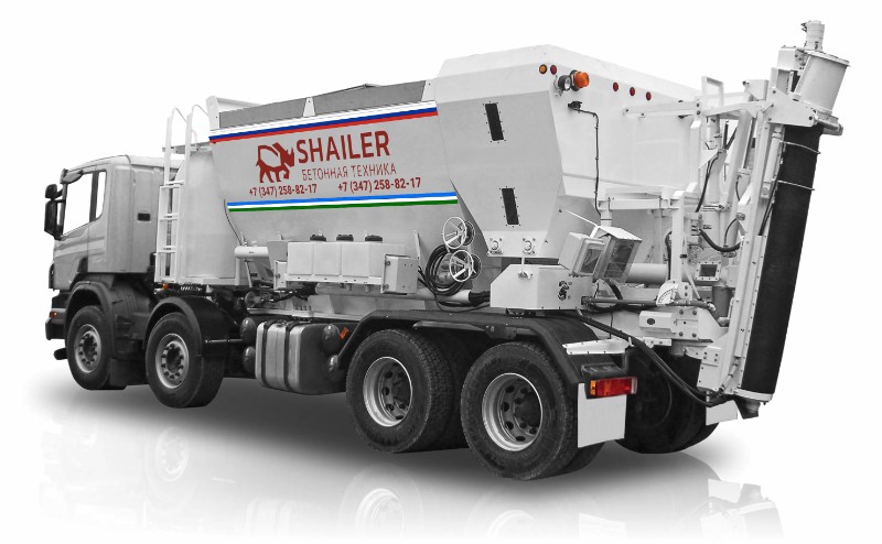 Автомобильный бетонный завод (Автобетонозавод) АБЗ-10 SHAILER (Шейлер, Шайлер). Возможна установка на шасси МАЗ 8x4 или на любое Ваше шасси. Предназначен для производства различных типов растворобетонных смесей на крупных строительных объектах при положительной температуре окружающего воздуха. Смешивание происходит на месте в соответствии с необходимым подобранным составом, установленным оператором, избегая рисков, связанных с доставкой готового бетона.