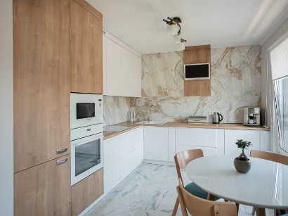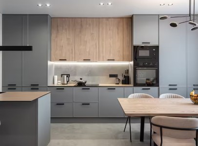 Сегодня актуальны натуральные материалы, изящные рельефные фасады и практичные шкафы до потолка. Всё чаще выбирают кухни без ручек и двухцветные гарнитуры — такие решения выглядят современно и долго сохраняют актуальность.