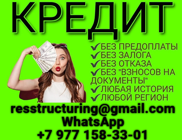 Ваша кредитная история не позволяет получить кредит в банке самостоятельно? Мы знаем, как Вам помочь и наше предложение для Вас! Успешно помогаем людям решить финансовые трудности. Работаем с самыми разными кредитными историями, просрочками, отсутствием официального источника дохода. Минимальный комплект документов, короткий срок рассмотрения Вашей заявки. Регион регистрации и проживания не важен! Помогаем с суммами до 5 миллионов рублей. Без залога, справок и предоплаты. За более подробной информацией обращайтесь на почту resstructuring@gmail. com или звоните по телефону и WhatsApp +7 977 158-33-01