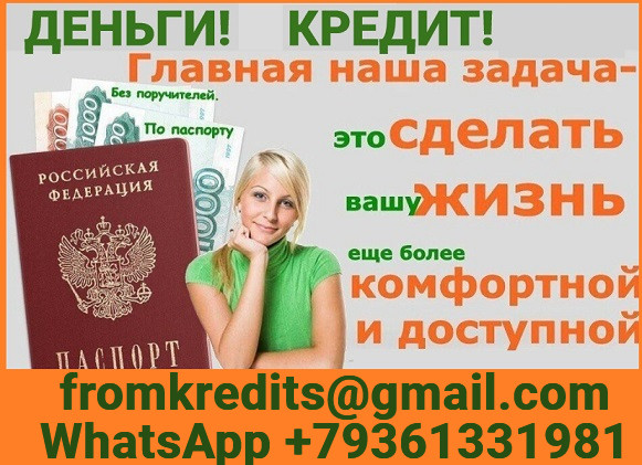 Гарантированный кредит в день обращения к нам! Помощь в сложных ситуациях, даже если у Вас негативная кредитная история, открытые просрочки в банках, большое количество отказов и стоп-лист. Для оформления кредита потребуется: постоянное гражданство РФ и возраст от 18 лет. Гарантированное получение до 5 миллионов рублей без залога. До 100 млн. рублей возможно оформление под залог. Наличие официального трудоустройства значения не имеет. Работаем в регионах РФ! Предоставляем гарантии. За более подробной информацией обращайтесь на почту fromkredits@gmail. com или звоните по телефону и WhatsApp +79361331981