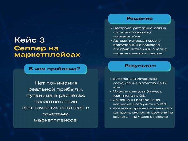Результат: вы получите понятные отчеты (ДДС, ОПиУ), рост прибыли, оптимизацию расходов, финансовую модель и снижение операционной нагрузки. Вы сможете сосредоточиться на стратегии.
