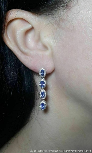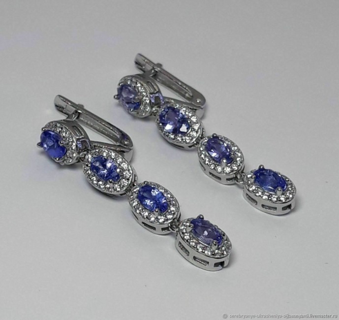 Серебряные серьги с натуральными танзанитами (Африка — Танзания) выполнены из серебра 925 пробы, покрытого белым золотом 14 карат. Размер танзанитов 4,0 х 3,0 мм. Размер серёжек 32,0 х 5,0 мм. Вес 5,2 г.