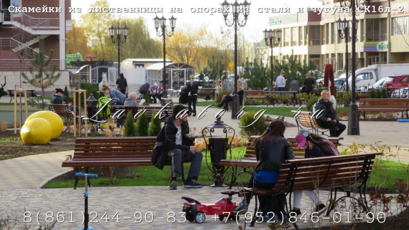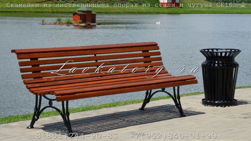 Скамейки парковые из лиственницы на опорах из стали и чугуна СК16л-2