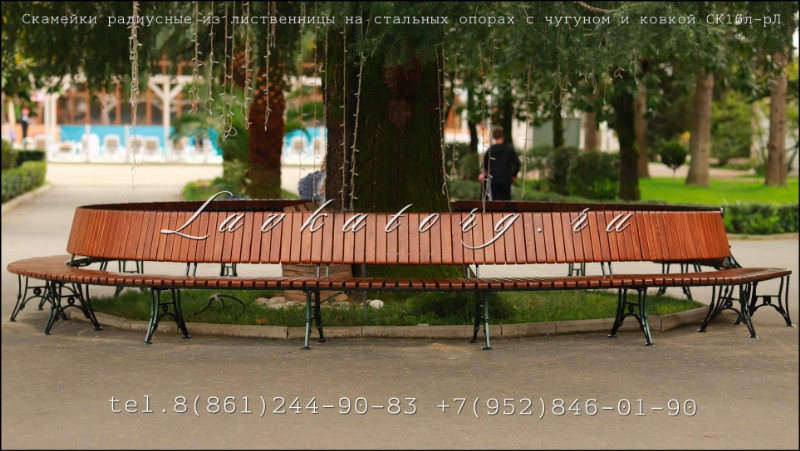 Скамейки радиусные с сиденьем и спинкой из бруса лиственницы на ажурных стальных опорах.