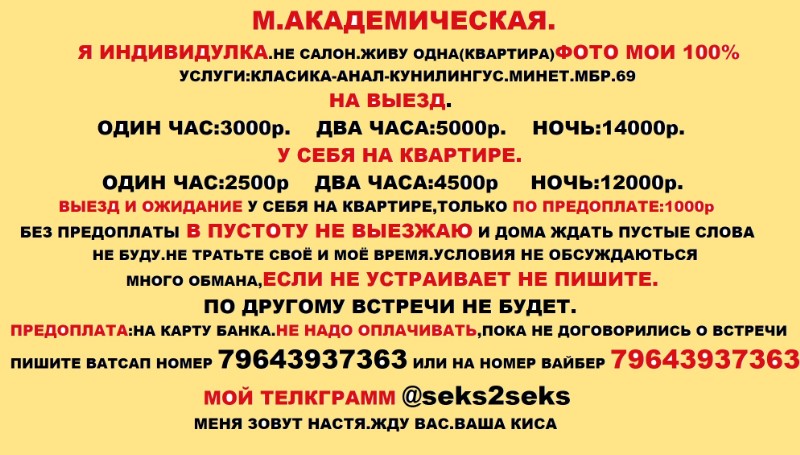 Я молодая и красивая, неутомимая в постельке и изобретательная любовница. Гарантирую индивидуальное общение на высшем уровне и организую для вас головокружительный отдых с массой чувственных наслаждений и сильнейших оргазмов. Заходите в фото, там условия встречи и написано куда писать ватсап 89643937363 телеграмм @seks2seks