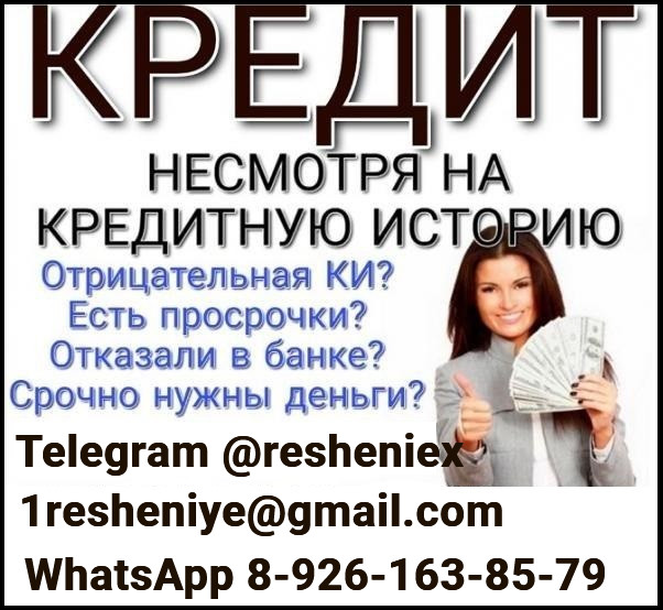 Доступный кредит на законных основаниях. Успешно помогаем при отсутствии официального трудоустройства и подтверждающих справок с работы, при испорченной кредитной истории и просрочках по действующим кредитам. Суммы возможные к получению без предоставления залога и поручителей до 5 000 000 рублей. Мы не берем авансовых платежей и предоплату в любом ее проявлении. Предложение актуально для лиц старше 20 лет. Работаем по всей РФ. Пишите в любое удобное время на электронную почту 1resheniye@gmail. com; Telegram @resheniex или WhatsApp 8-926-163-85-79